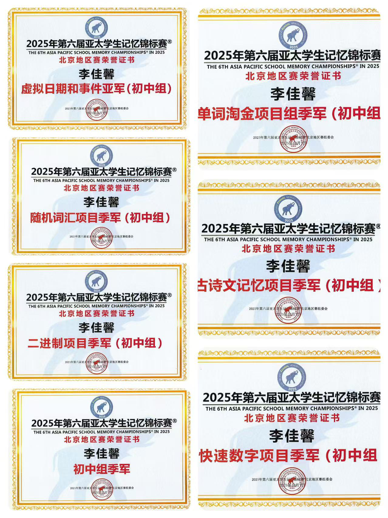 本人热爱科学奥秘,热衷提升创新潜能,希望能有机会与更多的优秀伙伴一起,探讨、学习,研究智慧科学,将来为我们的国家、我们的时代贡献一份力量。 本人学习成绩优异,在日常学习中,我始终保持对学习的热情和专注,成绩名列前茅。除在校学习外,我个人擅长并爱好在全脑记忆,英语,钢琴、美术,书法,舞蹈,表演等各个领域,且长期保持浓厚的学习欲望,并获得各类大赛奖项。 我不仅注重个人成长,还乐于助人,积极帮助同学解决学习难题。我认为,智慧不仅仅是知识的积累,更是解决问题的能力与创新的思维。 人物榜样:我的榜样“两弹一星”钱学森院士,希望长大后我也能为中国航天贡献力量。 人生理想:渴望成为一名航天员,探索宇宙的奥秘。 各项荣誉: 3岁学画画、舞蹈,4岁学钢琴、7岁学书法、乐高 2020年1月: 北京电视台“翩翩少年新春晚会”优秀小演员 2021年:第二十五届全国中小学生绘画书法作品比赛,荣获书法类三等奖 2021年:“ 舞艺新苗杯”少儿舞蹈艺术周中国舞金奖 2021年3月20: 北京广播电视台《我是少年》授予优秀小演员 2023年6月: 北京广播电视台“加油吧少年”荣获优秀小演员! 2023年: 2023致敬徐悲鸿青少年书画大赛金奖 2023年7月:第五届“致敬英雄”全国青少年文化艺术创作主题教育竞赛“描绘我心中的英雄”书法绘画大赛小学高龄组(4—6年级)北京市一等奖 2023年8月:首届全国青少年文化遗产知识大赛书画知识与实践专项赛 全省二等奖 2024年7月:“第二十八届全国中小学生绘画书法作品比赛”绘画二等奖 2024年7月: 全国青少年音乐素养大赛三等奖 2024年10月7日“国际记忆奥林匹克竞赛”业余级别1级 2025年1月:“学院之路·国际青少年艺术作品邀请展 金奖 2025年5月27:中国音乐学院钢琴6级 2025年7月1: 软笔书法考级8级 2025年7月:“第二十九届全国中小学生绘画书法作品比赛”绘画二等奖 2025.07.28日:韩国记忆公开赛“随机词汇儿童组银牌” 2025年:中国美术学院社会艺术水平九级