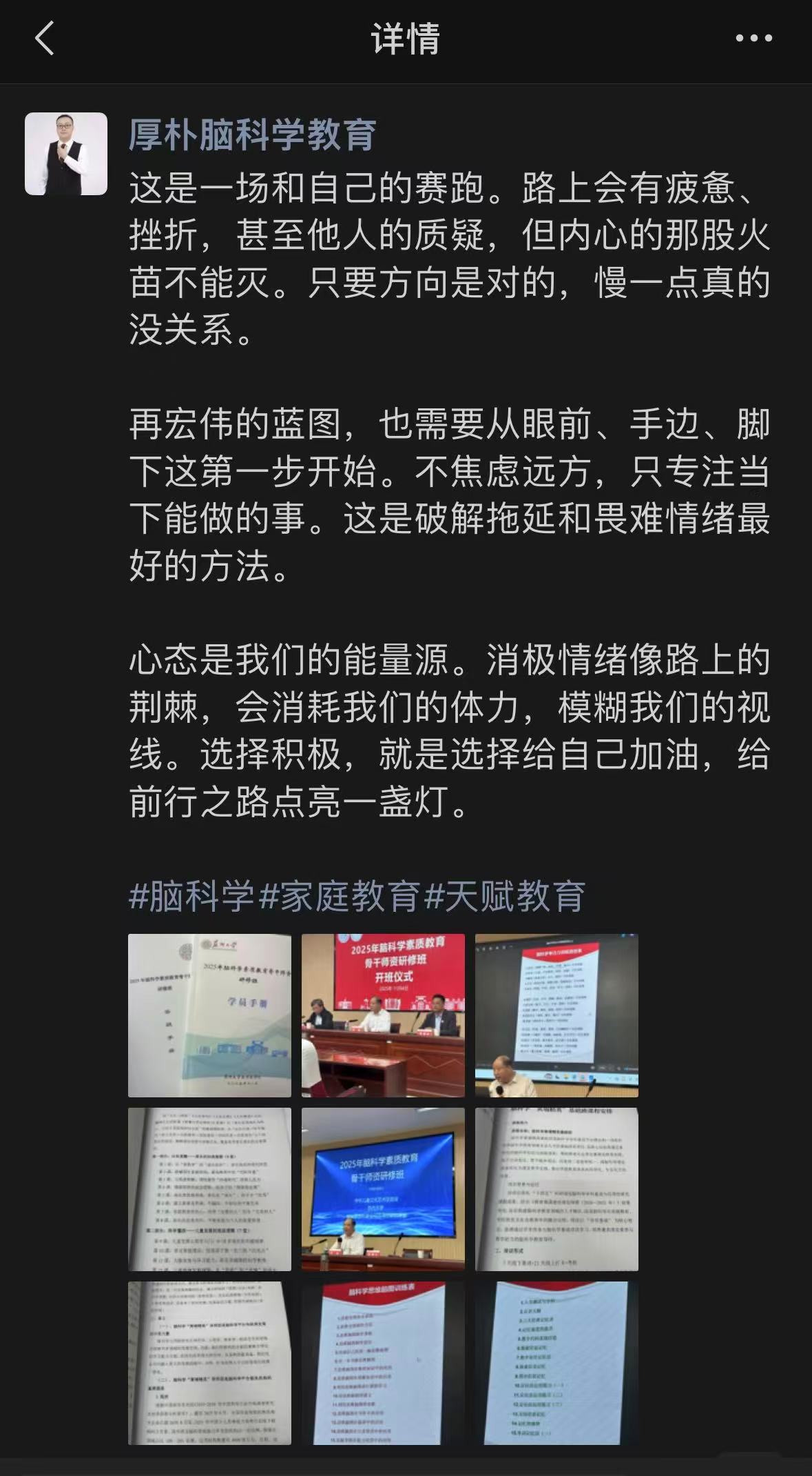 我个人从事医务工作及大健康行业几十年,对于脑科学的应用在健康方面我并不陌生,之前只想通过健康平台去分享,今天意识到是我狭隘了。其实脑科学的素质教育,它就包括了个人身心健康的教育,家庭健康、社会健康的教育,教育与健康本就应该是一体两面!