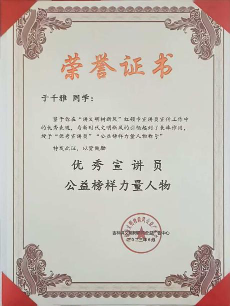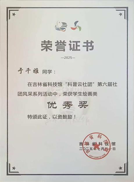 我是来自吉林省辽源市第一实验小学六年级的学生于千雅。对我而言,学习不仅是获取知识,更是一场探索大脑潜能的奇妙旅程。智慧教育为我打开了这扇大门,它像一位无处不在的“AI导师”,让我能随时随地接触优质资源,并根据我的节奏进行个性化学习,让知识的获取变得更高效、更有趣。 而脑科学则是我学习的“指南针”。它让我明白,科学用脑比盲目努力更重要。通过了解记忆规律和专注力原理,我学会了如何更科学地安排学习与休息,从而在语言艺术练习或作品理解时,能达到更佳的沉浸状态与记忆效果。 其中,快速阅读是我受益颇深的一项技能。它极大地提升了我的信息处理效率,让我能在短时间内浏览大量文献与经典,快速抓取核心思想与情感脉络。这不仅拓宽了我的视野,积累了丰富的表达素材,更让我在舞台上对作品的把握更加从容、深刻。智慧教育、脑科学与高效学习方法的结合,正帮助我一步步构建更强大的学习能力,让我能更自信地追逐梦想。 以下是我曾在接触智慧教育以后获得过的奖项。 1.2023年6月获得吉林讲文明树新风公益广告 “优秀宣讲员、公益榜样力量人物” 2.2022年1月8日获得FM90.1少儿春节晚会 “拉丁舞之星” 3.2024年4月10日获得辽源市第一实验小学 “‘红领巾奖章’一星章” 4.2023年获得“鼎拓杯”新人10岁女子单人A组L一等奖 5.2023年5月2日获得“鲁商杯”20岁单人单项新人恰恰组三等奖 6.2024年7月获得“华语杯”吉林省展区特金奖 7.2025年7月30日获得吉林省科技馆“科普云社团”优秀奖