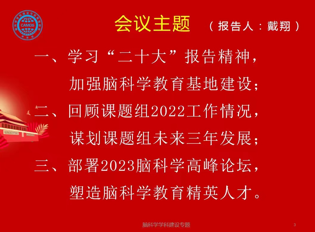 首先,在大家的相互问候中,由张静远秘书长的主持拉开了会议的序幕。接下来由戴翔主任重点报告了三项内容,分别是:一、学习“二十大”报告精神,加强脑科学教育基地建设;二、回顾课题组2022工作情况,谋划课题组未来三年发展;三、部署2023脑科学高峰论坛,塑造脑科学教育精英人才。