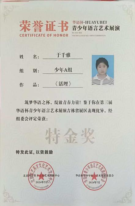 我是来自吉林省辽源市第一实验小学六年级的学生于千雅。对我而言,学习不仅是获取知识,更是一场探索大脑潜能的奇妙旅程。智慧教育为我打开了这扇大门,它像一位无处不在的“AI导师”,让我能随时随地接触优质资源,并根据我的节奏进行个性化学习,让知识的获取变得更高效、更有趣。 而脑科学则是我学习的“指南针”。它让我明白,科学用脑比盲目努力更重要。通过了解记忆规律和专注力原理,我学会了如何更科学地安排学习与休息,从而在语言艺术练习或作品理解时,能达到更佳的沉浸状态与记忆效果。 其中,快速阅读是我受益颇深的一项技能。它极大地提升了我的信息处理效率,让我能在短时间内浏览大量文献与经典,快速抓取核心思想与情感脉络。这不仅拓宽了我的视野,积累了丰富的表达素材,更让我在舞台上对作品的把握更加从容、深刻。智慧教育、脑科学与高效学习方法的结合,正帮助我一步步构建更强大的学习能力,让我能更自信地追逐梦想。 以下是我曾在接触智慧教育以后获得过的奖项。 1.2023年6月获得吉林讲文明树新风公益广告 “优秀宣讲员、公益榜样力量人物” 2.2022年1月8日获得FM90.1少儿春节晚会 “拉丁舞之星” 3.2024年4月10日获得辽源市第一实验小学 “‘红领巾奖章’一星章” 4.2023年获得“鼎拓杯”新人10岁女子单人A组L一等奖 5.2023年5月2日获得“鲁商杯”20岁单人单项新人恰恰组三等奖 6.2024年7月获得“华语杯”吉林省展区特金奖 7.2025年7月30日获得吉林省科技馆“科普云社团”优秀奖