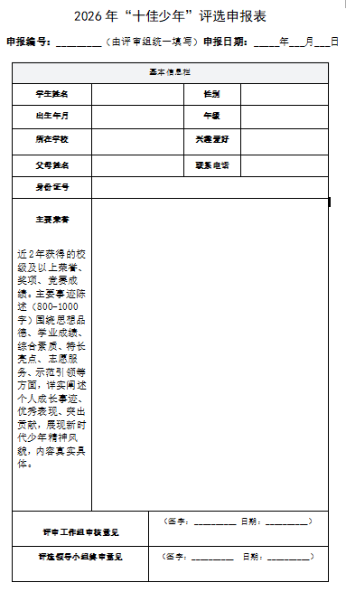 为深入践行立德树人根本任务,大力弘扬尊师重教良好风尚,挖掘表彰爱岗敬业、潜心育人的优秀导师,以及品学兼优、全面发展的新时代少年,充分发挥先进典型示范引领作用,营造崇德向善、争先创优的浓厚氛围,经研究决定,开展2026年“十佳导师”“十佳少年”荣誉评选工作。现将有关事项通告如下: